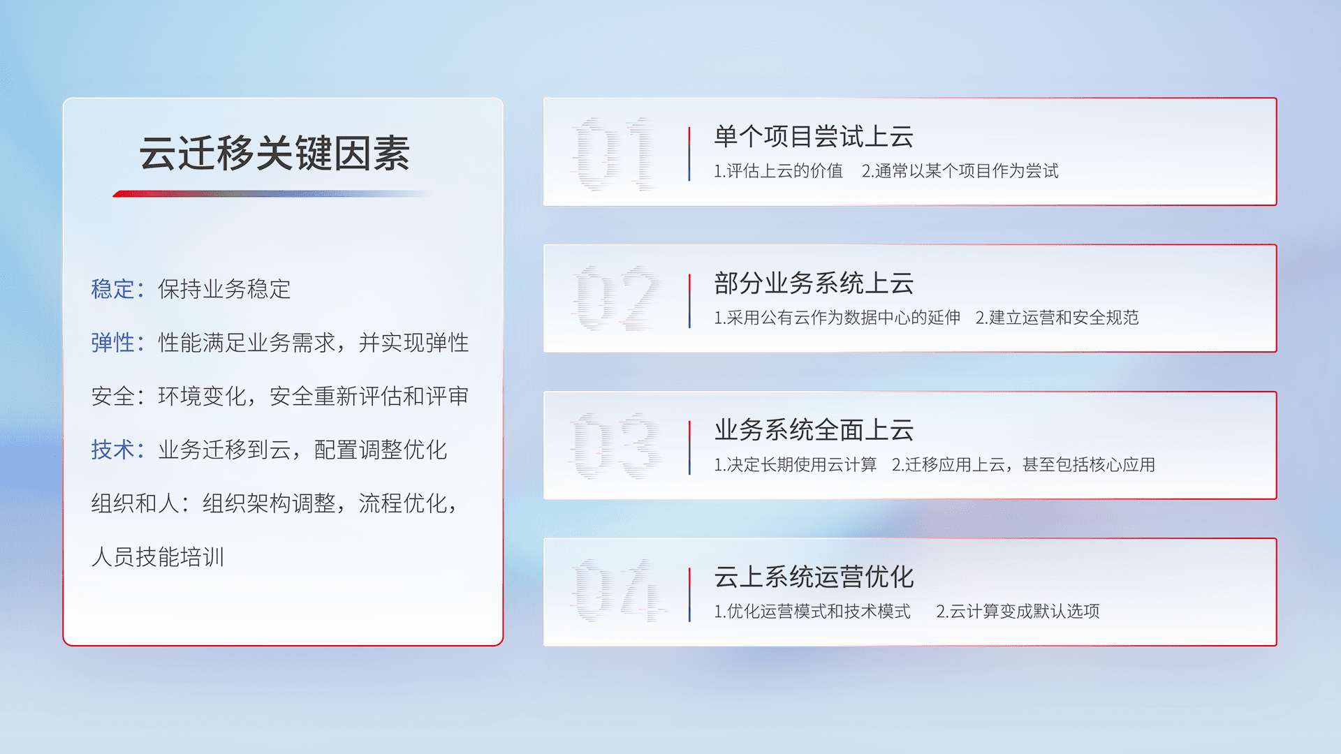 结合实际业务,,从规划设计、、、云平台选型、、、、云原生改造、、、、数据迁移、、、、集成交付,,迁移全过程为客户识别最佳上云路径,,做好风险识别管理,,,设计网络架构、、身份权限、、安全审计合规、、、、操作审计、、日志审计、、监控告警策略、、、多站点容灾设计等,,,,对云上基础设施进行整体规划,,,提升IT治理水平,,,以满足弹性、、、高可用、、、高性能的需求。。。。